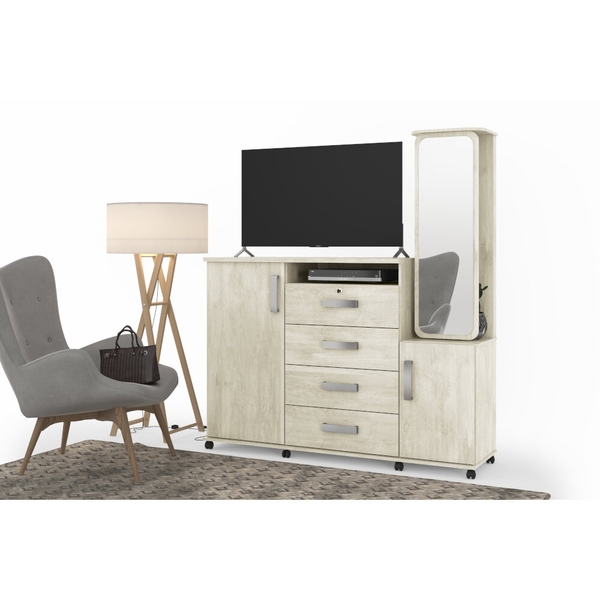 Cômoda Copacabana - Champagne A Cômoda Copacabana além de ser um espaço extra para roupas e acessórios, agrega também mais elegância ao ambiente Garante praticidade e funcionalidade no dia a dia facilitando a organização e deixando seu quarto ainda mais bonito e agradável. Contém puxadores cromados, trava na gaveta, espelho giratorio com porta objetos, cabideiro em aluminio, prateleira removível e rodízios. Informações do produto- Altura- 181 cm Largura- 162,5 cm Comprimento- 45 cm Itens inclusos- 01 Cômoda. Kit completo para montagem, manual detalhado de instruções para montagem. Garantia- 3 meses contra defeito de fabricação. Informações complementares- - Fotos meramente ilustrativas do produto no ambiente. - Os objetos que ambientam as fotos não acompanham o produto; - Verificar descrição e tamanho do produto antes da compra. - Avaliar a mercadoria no ato do recebimento e recusar em caso de divergência ou avarias. - Mantenha as informações de contato e endereço de entrega atualizados para entrarmos em contato caso necessário. - Limpar com flanela ou pano macio seco, não utilizar produtos abrasivos, desengordurantes, álcool ou solvente. Não expor o produto diretamente à luz solar e à umidade. * Sugerimos a contratação de um montador profissional para a montagem do produto. Não nos responsabilizamos por avarias causadas no ato da montagem. * Não nos responsabilizamos pela montagem e desmontagem do produto no ato da entrega e devolução, assim como os custos gerados nestas situações. * A transportadora entregará o produto no andar térreo do endereço de entrega. * Não nos responsabilizamos por subir escadas, corredores e elevadores ou transporte por guincho em apartamentos