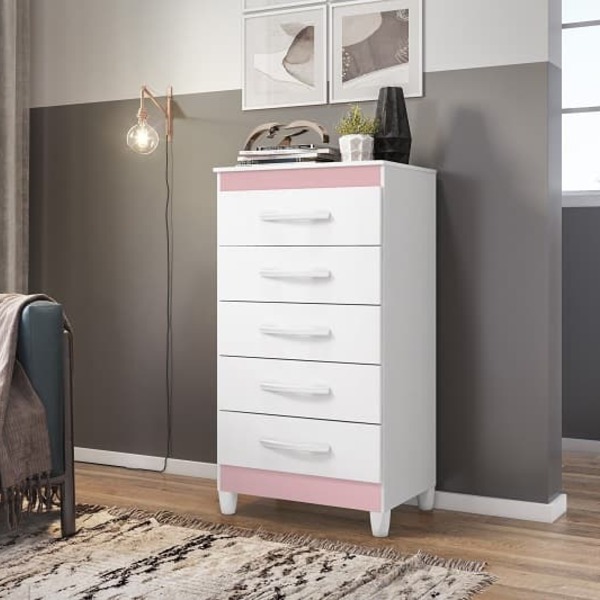Cômoda esmeralda - albatroz     características do produto: - cor: multiflex - rosa matte - material: mdp - gavetas: 5 - pintura: uv - acompanha manual de montagem   dimensões do produto: (axlxp) 1,04 x 0,56 x 0,40 peso: 25 kg volumes: 1   diferenciais: -puxadores com acabame...