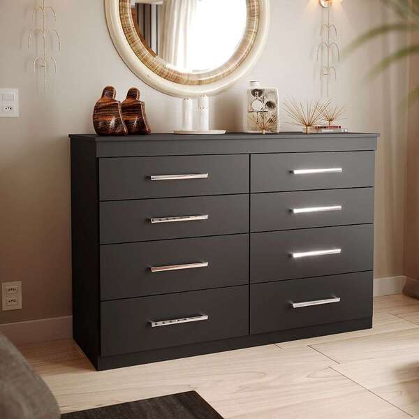 Que tal a cômoda gênova? Para complementar o quarto e ter uma boa ajuda na hora de organizar o vestuário, pode contar com a cômoda gênova! Com 8 gavetas, ela favorece sua organização no dia a dia, acomodando peças que podem ser dobradas, desde camisetas e calças até as meias - ou você também pode usar uma gaveta para cabos e itens eletrônicos. Feita em material resistente, a peça tem ótima durabilidade e design clean que torna fácil harmonizá-la com o restante dos móveis no seu cantinho de descanso. Tudo de bom, né?