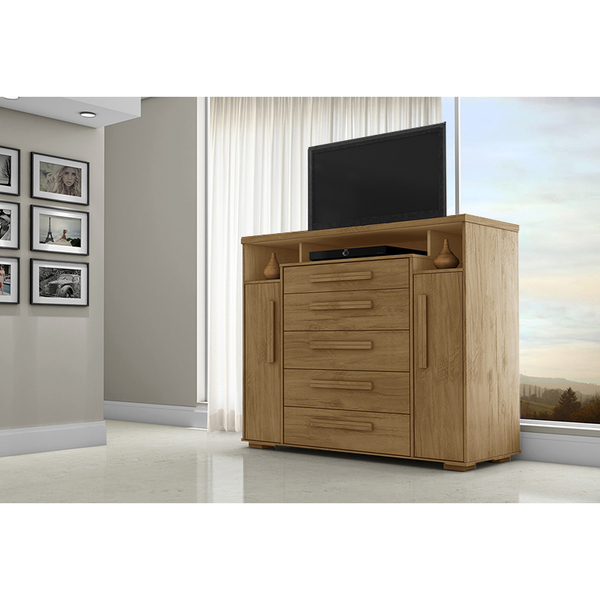 Cômoda, com 05 gavetas sendo uma com espelho interno, duas portas laterais, uma com prateleira outra com opção para cabideiro, tampo reforçado. dimensões do produto: altura: 116,5cm largura: 124,5cm profundidade: 46cm peso: 76,5kg garantia do fornecedor: 03 meses.
