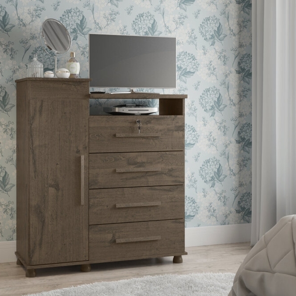 Cômoda juma 4 gavetas - imbuia a cômoda juma é a cômoda mais completa da linha, com ela você tem tudo em um lugar só. além das 4 gavetas, conta com o espaço para tv e aparelhos eletrônicos como receptores de canais, dvd, blueray ou outros. sua lateral ainda conta com uma sapateira ampla, com três divisórias para separar e organizar da melhor maneira possível os sapatos sem causar bagunça. além de tudo isso, ela ainda conta com porta jóias, com divisórias para facilitar na organização e um espelho para auxiliar na hora de se arrumar. as gavetas possuem corrediças metálicas, sendo a primeira com tranca e chave para guardar com mais segurança objetos mais importantes. é perfeita! Prática, bonita e completa, tudo o que você precisa para manter tudo bem organizado e decorado. informações do produto: altura: 119,5 cm largura: 104,5 cm comprimento: 45 cm itens inclusos: 01 cômoda. kit completo para montagem, manual detalhado de instruções para montagem. garantia: 3 meses contra defeito de fabricação. informações complementares: - fotos meramente ilustrativas do produto no ambiente. - os objetos que ambientam as fotos não acompanham o produto; - verificar descrição e tamanho do produto antes da compra. - avaliar a mercadoria no ato do recebimento e recusar em caso de divergência ou avarias. - mantenha as informações de contato e endereço de entrega atualizados para entrarmos em contato caso necessário. - limpar com flanela ou pano macio seco, não utilizar produtos abrasivos, desengordurantes, álcool ou solvente. Não expor o produto diretamente à luz solar e à umidade. * sugerimos a contratação de um montador profissional para a montagem do produto. Não nos responsabilizamos por avarias causadas no ato da montagem. * não nos responsabilizamos pela montagem e desmontagem do produto no ato da entrega e devolução, assim como os custos gerados nestas situações. * a transportadora entregará o produto no andar térreo do endereço de entrega. * não nos responsabilizamos por subir escadas, corredores e elevadores ou transporte por guincho em apartamentos.