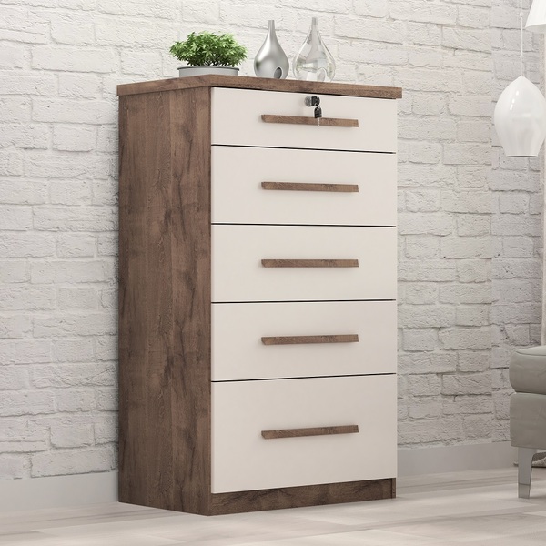 A cômoda Lara com 5 gavetas é um móvel de armazenamento versátil e seguro. Com um design elegante e funcional, ela oferece ampla capacidade de armazenamento para roupas, acessórios e outros itens pessoais. Quatro das gavetas são convencionais, com fechamento padrão, enquanto a primeira gaveta é especialmente projetada com uma fechadura e requer uma chave para ser aberta. Ela oferece não apenas funcionalidade, mas também agrega estilo e elegância ao espaço.