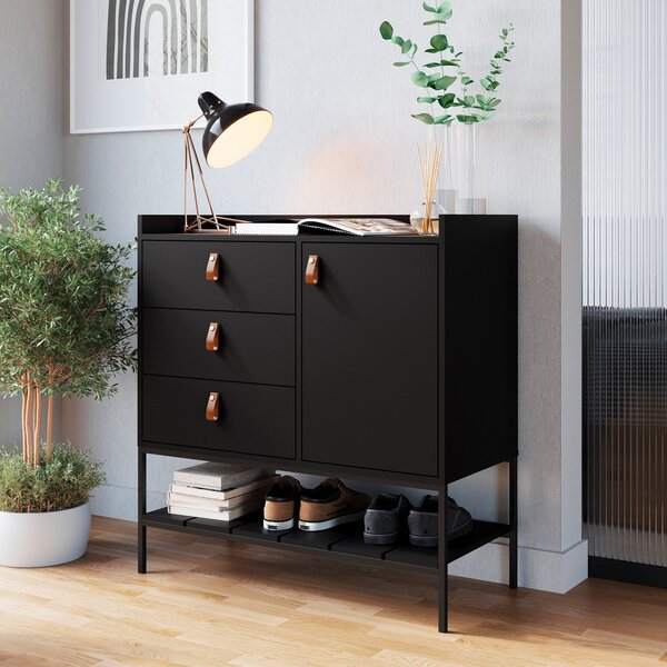 Cômoda multifuncional personal quartos preto. Cômoda multifuncional personal, uma peça excepcionalmente versátil e estilizada para elevar o charme de qualquer ambiente. Fabricada com precisão em mdp bp 15mm, esta cômoda se destaca pela sua qualidade duradoura. Com três gavetas equipadas com corrediças telescópicas, a organização é uma experiência eficiente e elegante. O puxador em couro adiciona um toque de luxo, enquanto os pés em aço carbono 15x15mm proporcionam estabilidade robusta. Estilo: moderno peso (kg): 33 garantia: 03 meses altura (cm): 93.5 acabamento: bp largura (cm): 90 possui pés: 2 possui nichos: não possui portas: sim tipo de porta: bater altura dos pés: 33 pés reguláveis: não possui gavetas: sim possui rodízio: não suporta até (kg): 30 tipo de cômoda: adulto possui espelhos: não profundidade (cm): 40.3 escala de brilho: fosco gaveta com chave: não material dos pés: aço serviço montagem: 114259443 material da porta: mdp material do fundo: eucatex 3 mm origem do produto: nacional acabamento dos pés: pintura ambiente principal: quarto material da gaveta: mdp material principal: mdp possui prateleiras: sim acabamento da porta: bp sapatas niveladoras: não acabamento da gaveta: bp material da prateleira: mdp peso máximo por gaveta: 5 acabamento da prateleira: bp tipo de puxador da porta: externo escala de brilho da porta: fosco tipo de puxador da gaveta: externo escala de brilho da gaveta: fosco peso máximo por prateleira: 3 tipo de corrediça da gaveta: metálica telescópica material do puxador da porta: couro material do puxador da gaveta: couro escala de brilho da prateleira: fosco tipo de dobradiça/corrediça da porta: aço fabricante: metta mobili marca: metta mobili cor interna: preto cor: preto cor do produto: preto itens inclusos: 1 comoda multifuncional personal1 manual de montagem1 kit ferragens. Cor predominante: preto cor do puxador: marrom quantidade de prateleiras: 01 prateleira quantidade de gavetas: 03 gavetas
