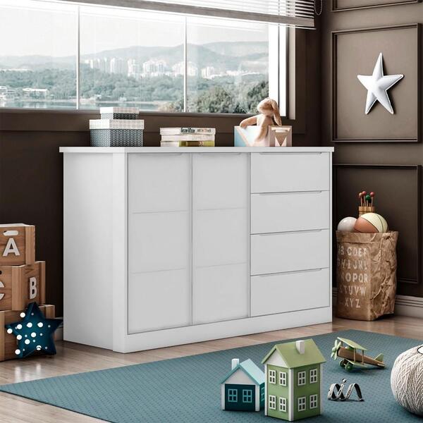 Dimensões do produto:largura 130 cm; profundidade 54 cm; altura 92 cm;itens inclusos:1 cômoda- produzido em 100% mdf 15mm/12 mm- pintura uv atóxica/acetinada para não prejudicar a saúde do bebê e das crianças- 2 portas com excelente espaço interno- 4 gavetas com corrediças te...