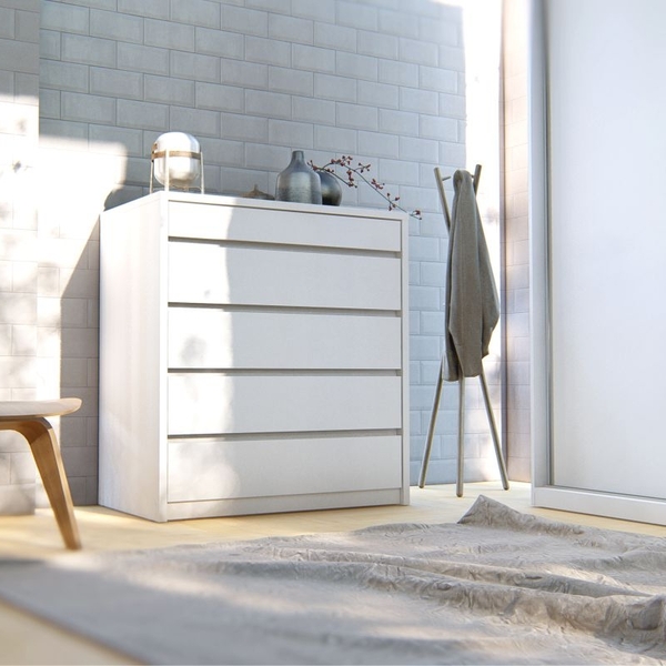Cômoda premium 5 gavetas branco a cômoda premium 5 gavetas é o que faltava para o seu quarto. elaborada em mdp e mdf, possui tampo, base e laterais feitos em mdp de 25mm, travessas em mdp de 15mm, e organizador interno em mdf, suportando até 40 kg. sua pintura conta com ac...