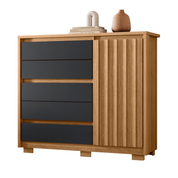 Essa cômoda é perfeita para você que procura sofisticação e e praticidade na hora da organização feito em mdp.possui detalhes ripados na porta e contém 5 gavetas com corrediças telescópicas, o tampo e molduras de 25mm. Dimensão da cômoda: altura: 109 cm largura: 125 cm compri...