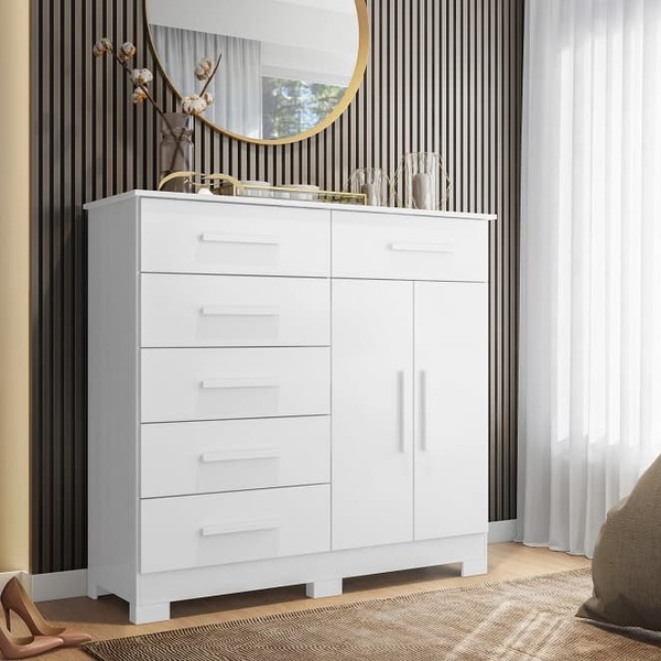 A cômoda xangai possui um design elegante com cores modernas e conta com um ótimo espaço para armazenamento, distribuídos em 6 gavetas e 2 portas com prateleira interna. É o produto ideal para proporcionar organização e charme ao seu ambiente!   características:   - medidas (axlxp): 1,17 x 1,24 x 0,42 m - peso: 45,9 kg - cor: branco brilho - material: mdp - gavetas: 6 - portas: 2 - prateleira interna - puxadores em mdf revestidos - corrediças telescópicas - 6 pés inclusos.     informações gerais:   - necessita montagem (acompanha manual) - para limpeza utilize somente pano limpo e macio, ligeiramente umedecido em água (apenas o bastante para remover a poeira), seguido de um pano seco. - a loja se responsabilizará pela entrega dos produtos até onde as rodovias alcançam, entregas fluviais ou aéreas devem ser cotadas a parte. - a montagem será de responsabilidade do comprador. Não nos responsabilizamos, no ato da entrega, por subir escadas/elevadores ou transporte por guincho em apartamentos. Eventuais despesas são de responsabilidade do comprador. - as imagens são ilustrativas, não acompanham objetos de decoração. - confira as dimensões do produto e certifique-se de que passará normalmente por supostos elevadores, portas, escadas e/ou corredores de sua residência.     - garantia do fornecedor: 3 meses - fabricante: albatroz