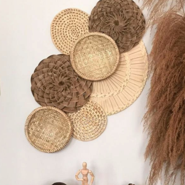 Especificações técnicas: 2 mandalas trançadas2 unidade p 24-29 cm1 leque de 45-40 cm                 2 cestos p 24-29 cm      * tamanho aproximado do painel:entre 85 cm x 60 cm aproximadamente, o tamanho final da composição pode variar dependendo do espaço entre as peças na i...