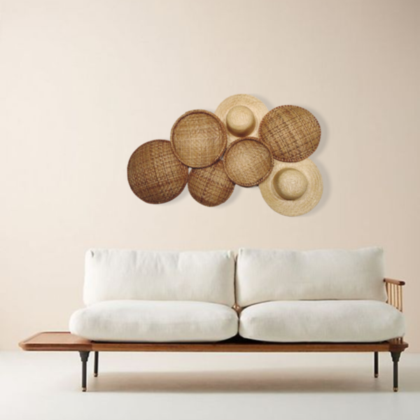 a composição maitê feito à mão por artesões do nosso brasil, iram valorizar e trazer conforto aconchego para seu lar com leveza e naturalismo mesmo nas decorações mais contemporâneas os cestos em palha traduz um design atemporal.  as paletas palha nude estão sempre presentes em nossas composições se tornando peças únicas que vão combinar com qualquer estilo de decoração proporcionando todas as sensações e emoções para a sua casa e sua vida.  os artesões trabalham com técnicas diversas, tiram o seu sustento herdado pelos seus ancestrais como tecelagem e trançados de fibras naturais de tucumã, arumã, carnaúba, uruba, taboa e outras palhas naturais de palmeiras nativas da região norte e nordeste do país. Além das palmeiras, utilizam, penas e sementes entre outras dando origem a diversos artefatos.  com esse rico e diverso material que colhem nas matas e que manejam de forma respeitosa e sustentável, produzem porta-joias, cestos, potes, bolsas, brincos, colares, pulseiras, entre outros artefatos.  expecificações técnicas:  1 cesto 37-402 cestos m 30-322 cestos p 22-242 chapéus 35 cm   tamanho aproximado do painel: entre 130 x 100 cm dependendo do espaço entre as peças pode chegar até mais. as peças vão soltas e podem ser usadas na horizontal ou vertical como desejar!  total: 7 peças  palhas presentes: palha de carnaúba, palha de arumã e uruba. dependendo do espaçamento entre as peças.  observações:  por se tratar de um produto feito à mão artesanalmente, sua cor e tamanho pode variar ligeiramente.
