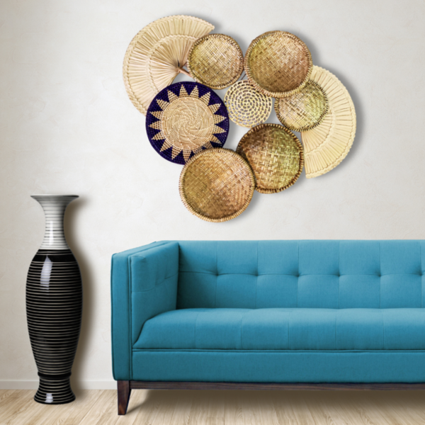 ** expecificações técnicas cestos: * 3 unidades m 30 a 35cm. * 2 unidades p 22 a 25cm.* 2 leque 32 a 42cm.* 1 mandala colorida . * 1 furadinho 20cm***** total: 9 peças.--> observações: <--por se tratar de um produto feito à mão artesanalmente, sua cor e tamanho pode variar ligeiramente. As peças vão soltas e podem ser usadas na horizontal ou vertical como desejar!   *** nosso diferencial:* nossos cestos são apropriados para parede* ao comprar nossas peças em nosso acervo, você vai estácontribuindo para a valorização do artesanato brasileiro.* atendimento rápido.* após sua compra temos uma equipe de vendedores para te atender.* produtos a pronta entrega* peças de qualidade superior para pessoas exigentes e de bom gosto!* envio imediato, após confirmação de pagamento.* embalagem impecável e reforçada.* todos os nossos cestos já vão impermeabilizados contra pragas e fungos, assim eles vão durar por anos!* contém: um manual de instalação + mini pregos.* fácil instalação!.tags relacionadas: painel de parede, cestos de parede, composição de cestos, cestos de palha, palha de carnaúba, decoração para parede, decoração boho, peneira de palha, peneira indígena, cesto indígena, decoração contemporânea, cesto étnico, composição para parede, quadros, cestos étnicos, cestos do paquistão, cestaria, como decorar com cestos de palha, decoração boho, cestos taboa, cestos carnaúba, carnaúba, souplast de palha, souplast rústico, suplat de palha, supla de palha, suplat rustico, suplat rustica, supla de palha, decoração de interiores, casa cor 2021, casa vogue 2021, prato de parede, prato para parede, taboa