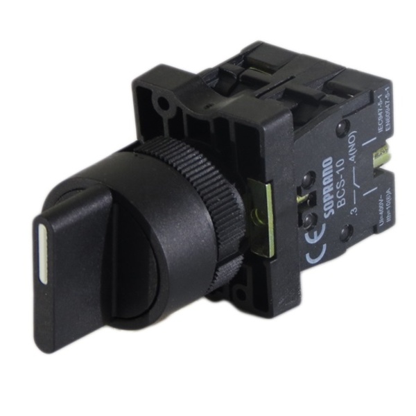 Comutador / seletor  3 posições fixas, contatos 2 na; fabricada em termoplástico de alta resistência  foi desenvolvida de forma bem versátil sendo parcialmente desmontável e permitindo ao instalador maior rapidez na conclusão dos trabalhos. corpo e aro na cor preta. Disponíveis para furação de 22mm. Características: - contatos inclusos: 2 na - tensão máxima de operação: 400vca - capacidade nominal: 10a – 250vca.
