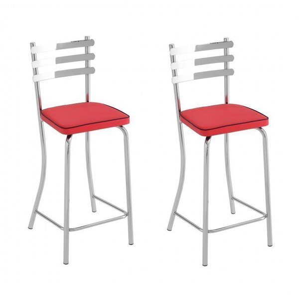 Conjunto 2 banquetas bistrô unimóvel cromado. Banqueta alta, para bancadas altas, assento estofado vermelho com detalhe em debrum preto, espuma maior e mais confortável. Apoio para lombar e pés. Encosto em três chapas lisas, um misto de conforto com sofisticação. Ambiente: null suporta até (kg): 100 kg possui rodízio: não ambiente principal: cozinha