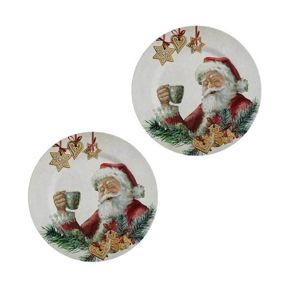 As cores tradicionais do natal trazendo o papai noel e as guirlandas em evidência.   material: cerâmica conteúdo da embalagem: 2 pratos sobremesa   cuidados de limpeza e uso: lavar com detergente neutro esponja macia e secar imediatamente não usar esponja de aço suporta máquina de lava-louças e micro-ondas para realçar o brilho usar uma flanela
