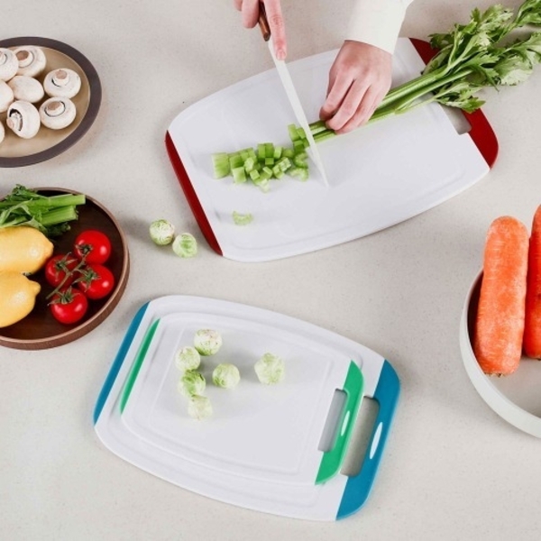 • Ação antimicrobiana kleon protege ao longo de toda a superficie de corte e punho; • Alça com material suave; • Dispositivo anti-deslizamento na bancada; • Uso reversível em ambos os lados; • Superfícies não porosas e não absorventes; • Seguro para uso em lavadouras de louça; • Não deixam as facas cegas; • Coletor de suco nas bordas; • Código: CB-BJ-3PCS.