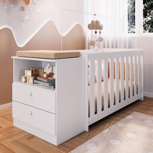 Conjunto aconchego berço e cômoda - brancoo conjunto aconchego, como o próprio nome diz, traz aconchego ao bebê e ao ambiente, sendo versátil, elegante e de fácil combinação com diversos tipos de decoração. Combinação perfeita do berço com a cômoda da linha aconchego. Berço com 3 regulagens de altura e cômoda de linda cominação, com 2 gavetas e 1 nicho. Podem ser montados juntos ou também separados. Mdppainel de madeira formado por partículas de madeira de média densidade, é também o mais consumido no mundo. É produzido em prensas contínuas de última geração, sendo um dos produtos mais tecnológicos e econômicos para produção de móveis de linhas retas ou que precisam receber pinturas e revestimentos de qualquer material. Apresenta excelente resultado em móveis para dormitórios, escritórios, cozinhas, painéis para decoração, prateleiras, tampos e base superior/inferior. Com o manuseio correto e dispositivos de montagem, pode ser montado e desmontado quantas vezes for necessário.garantia03 meses para defeitos de fábricacaracterísticas do berço- branco- estrutura: mdp 15mm / grades em mdf- acabamento: finish foil fosco- estrado com 03 regulagens de altura (09cm/23cm/38cm até o chão)- para colchão 130x60cm (não incluso)- suporte para mosquiteiro- peso suportado: até 30kg- certificado pela certa ocp 0033 - registro 000772/2022 - inmetro- móvel entregue desmontado- marca: completa móveiscaracterísticas da cômoda- branco- estrutura: mdp 15mm - acabamento: finish foil fosco- 2 gavetas- corrediças metálicas- 1 nicho- puxadores em pvc- peso suportado: até 16kg- móvel entregue desmontado- marca: completa móveisdimensões do berçopeso: 23,08 kgaltura:71,6 cmlargura: 133 cmprofundidade: 64,8 cmdimensões da cômodapeso: 16,65 kgaltura:68 cmlargura: 60,80 cmprofundidade: 38,50 cmoutras informações- montagem não inclusa.- na limpeza não utilizar produtos químicos e abrasivos, usar apenas um pano umedecido, para garantir a maior durabilidade do móvel.- os objetos que ambientam as fotos não acompanham o produto.- imagens meramente ilustrativas. Cores e tonalidades podem variar.- antes de comprar o seu produto verifique as medidas, o local onde pretende instalar e se é necessário contratar o serviço de um profissional qualificado.