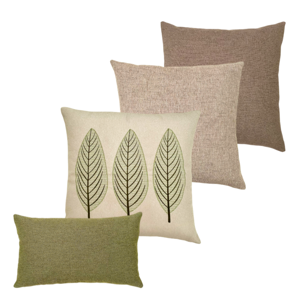 Conjunto envolvente, em tons bege, marrom, cru e verde, trazidos da natureza, texturas e tramas em linho, protagonizado com belo bordado em tons de verde. Delicadeza, elegância e conforto com um charmoso design.  almofadas quadradas: 50cm x 50cm almofada retangular: 50cm x 3...