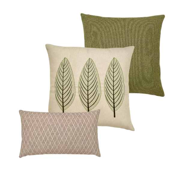 A almofada em trama na cor verde adiciona textura, enquanto a almofada bordada com 3 folhas em tons de verde, traz frescor para o seu espaço. Completando, uma linda almofada retangular bege bordada que remete ao visual dos trabalhos indígenas de cestaria, oferece um contraste artesanal contemporâneo.