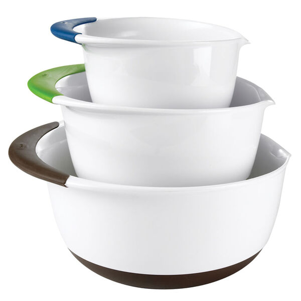 Produzido pela americana oxo good grips excelente conjunto de tigelas em plástico de alta qualidade com alças macias e fundo antiderrapante. Conjunto de 3 tigelas em tamanhos diferentes para auxiliar no preparo de massas saladas ou servir direto à mesa. Alças coloridas e macias e fundo antiderrapante que garantem conforto e segurança no manuseio. Design diferenciado com bico inteligente para a retirada do alimento evitando que haja desperdício e sujeira.