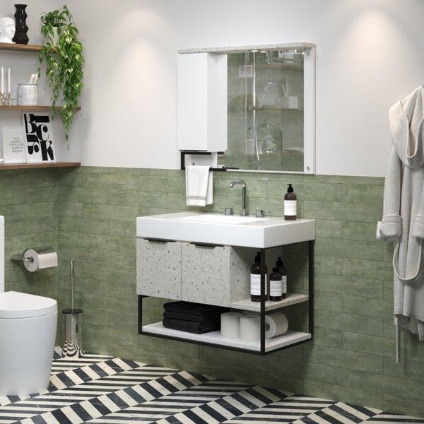 Conjunto de banheiro chicago 80cm cosmo - o conjunto chicago 80cm é um móvel da nossa linha "industrial", pois tem acabamento em ferro pintado em preto a pó preto fosco, que dá um certo charme ao produto e um estilo único, este gabinete possui um lavatório branco com válvu...