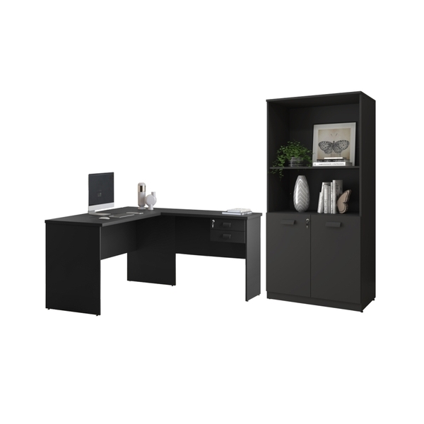 O conjunto de escritório é perfeito para você que deseja melhorar o visual do seu cômodo! medidas do armário: altura: 160 cm largura: 80 cm comprimento: 40 cm informações do armário: cor: preto material: mdp-bp de 15 mm portas: sim (2) prateleira: sim (3, sendo 2 móvel e 1 fixa) medidas da mesa: altura: 74 cm largura: 150/150 cm comprimento: 60 cm informações adicionais da mesa: cor: preto material: mdp-bp gavetas: sim (2, com tranca na primeira) itens inclusos 1 armário 1 mesa em l kit completo para montagem, manual detalhado de instruções para montagem. garantia 3 meses contra defeito de fabricação instruções de limpeza limpar com flanela ou pano macio seco, não utilizar produtos abrasivos, desengordurantes, álcool ou solvente. Não expor o produto diretamente à luz solar e à umidade * sugerimos a contratação de um montador profissional para a montagem do produto. Não nos responsabilizamos por avarias causadas no ato da montagem. * não nos responsabilizamos pela montagem e desmontagem do produto no ato da entrega e devolução, assim como os custos gerados nestas situações. a transportadora entregará o produto no andar térreo do endereço de entrega. Não nos responsabilizamos por subir escadas, corredores e elevadores ou transporte por guincho em apartamentos. *imagens meramente ilustrativas