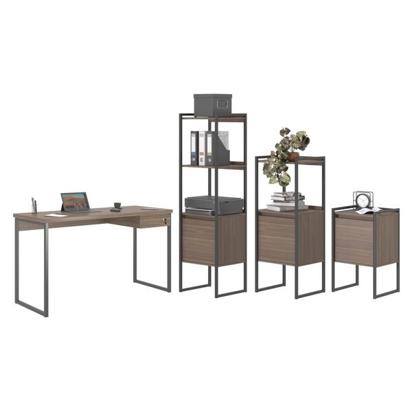 Conjunto escrivaninha e armarios em mdp perfex 15 mm com acabamento de bordas em abs, armarios em 3 versões com prateleiras e porta objetos estrutura em aço 20x20 com pintura epoxi nas cores preto e cobre. a escrivaninha veio para deixar seu ambiente mais moderno. tampo ...