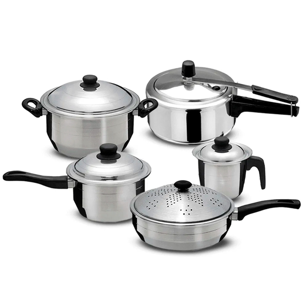 1 panela de pressão: diâmetro: 20 cm/ altura: 10 cm/ capacidade: 3 l/ 1 panela caçarola: diâmetro: 18 cm/ capacidade: 1/5 l 1 frigideira: dimensões produto 19cm 1 panela: diâmetro: 16 cm/ capacidade: 1l 1 leiteira: diâmetro: 14cm/ altura:12 cm/ capacidade: 1litros material da tampa: alumínio material pegador: braquelite antitérmico material: alumínio material externo: polido