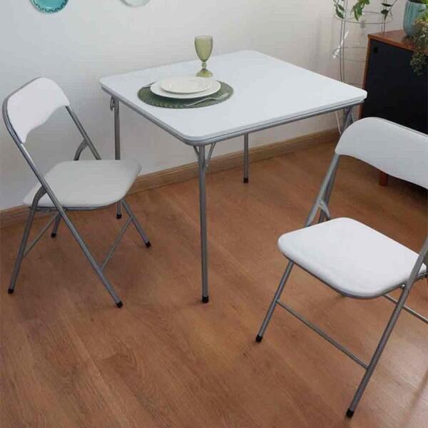 Conjunto dobrável caxambu branco - antares cadeira dobrável descrição: estrutura em ferro com pintura automotiva. Assento em poliester, impermeável e de alta resistência. Totalmente dobrável. Especificações técnicas largura: 43cm altura: 78cm profundidade: 44cm material: assento em poliester, impermeável e de alta resistência. Cor: branca orientações gerais: não utilizar como escada. Não apoiar apenas nas duas pernas trazeiras. Peso suportado 80kg. Mesa dobrável caxambu descrição: estrutura em ferro com pintura automotiva. Tampo em mdf 15mm. Pés retráteis, totalmente dobrável. Especificações técnicas largura: 82cm altura: 70cm profundidade: 82cm material: estrutura em ferro com pintura automotiva, tampo em mdf de 15mm. Cor: branca orientações gerais: abrir os pés até o clique. Não subir ou sentar sobre a mesa.