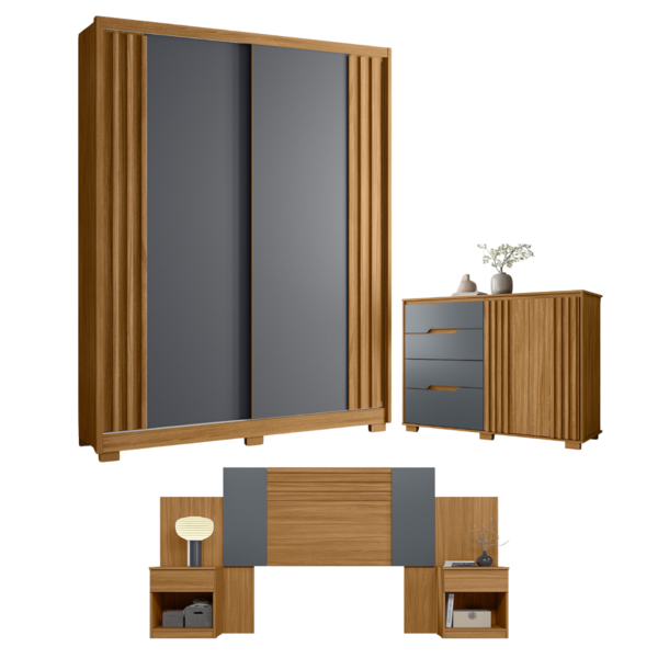 Este conjunto é perfeito para deixar seu quarto perfeito e organizado. o guarda roupa com 2 portas perfeitas para guardar e organizar suas roupas, caixas ou sapatos. a cômoda contém porta com acabamento ripado, possui quatro gavetas com espaço amplo.o conjunto de cabeceira segue o mesmo design elegante com acabamento ripado e verniz fosco.os três produtos são produzidos em mdp. Dimensão do guarda roupa: altura: 230 cm largura: 175 cm profundidade: 52 cm informação do produto: cor: freijó/cinza gavetas: sim (3) portas: sim (2) prateleiras: sim (6) pés: sim (6) cabideiros: sim (2) acompanha espelho: sim dimensões da cômoda: altura: 105 cm largura: 147 cm profundidade: 47 cm informações do produto: cor: freijó/cinza portas: sim (2) prateleira: sim (1) gavetas: sim (4) dimensões do conjunto de cabeceira: altura: 115 cm largura: 235 cm profundidade: 39 cm informações do produto: cor: freijó/cinza portas: sim (2) prateleira: sim (1) gavetas: sim (4) itens inclusos:1 guarda roupa1 cômoda1 cabeceirakit completo para montagem e manual de instruções garantia: 3 meses contra defeito de fabricação informações adicionais: - fotos meramente ilustrativas do produto no ambiente. - os objetos que ambientam as fotos não acompanham o produto; - verificar descrição e tamanho do produto antes da compra. - avaliar a mercadoria no ato do recebimento e recuse em caso de divergência ou avarias. - mantenha as informações de contato e endereço de entrega atualizados para entrarmos em contato caso necessário. - limpar com flanela ou pano macio seco, não utilizar produtos abrasivos, desengordurantes, álcool ou solvente. Não expor o produto diretamente à luz solar e à umidade. * sugerimos a contratação de um montador profissional para a montagem do produto. Não nos responsabilizamos por avarias causadas no ato da montagem. * a transportadora entregará o produto no andar térreo do endereço de entrega.