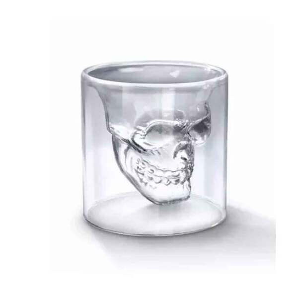 Copo caveira wine glass 150ml um copo cheio de personalidade para servir drinks e coquetéis onde você pode inovar no seu bar e usar como peça de decoração. Copo de caveira wine glass 150ml em vidro  onde o liquido fica com o formato da caveira proporciona estilo nos coqueteis como licores vodkas xaropes artesanais e muito mais.    material: vidro função: copo para servir bebidas medidas do copo: altura: 8 5cm diâmetro da boca: 6 5cm diâmetro da base: 7cm capacidade: 150ml peso: 115g características gerais: - inovação e estilo para seu bar - liquido no formato cabeça de caveira - crânio de vidro cristal