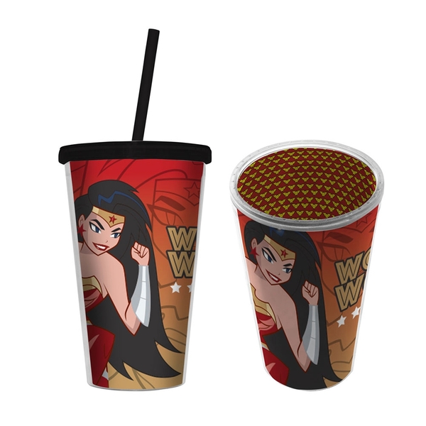 • copo plástico com canudo • mulher maravilha • material: plástico • capacidade: 500 ml • tamanho: 10 x 6,5 x 15,6 cm • cor: vermelho