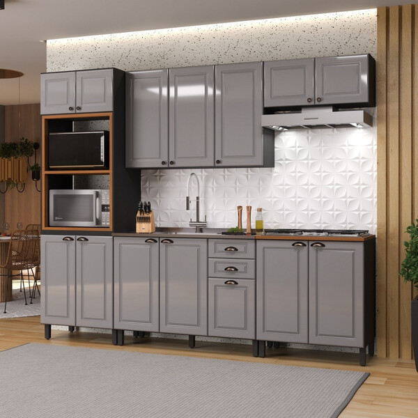 A cozinha firenze tem a composição de cozinha que une beleza e durabilidade. O produto é fabricado em mdf 15mm. Na sua composição tem o paneleiro para adequar 2 forno/micro com prateleira interna e portas em mdf 15mm com bordas usinadas e face desenhada com acabamento em pintura pu nas bordas e face em pintura uv, balcão (sem tampo) para lavar louça com 3 portas e 2 gavetas com prateleira interna, armário 1,20 com 3 portas, armário 80cm para colocar sobre geladeira ou fogão, balcão 80cm com 2 portas ideal para adequar cooktop (gabarito para recorte vai na caixa)possui prateleira interna. Para esta cozinha tem a perfeita harmonia nos contrastes das tonalidades entre os pés e puxadores em metal. característica: estrutura em mdf 15mm, acabamento: revestida em fita de borda em melamina, portas em mdf 15mm com bordas camadas de proteção da pintura ultra violeta, pés com regulagem de altura, puxadores alça em metal, dobradiça reta metálica com amortecedor espaço para forno suporta até 20kg, prateleira até 5kg. gaveta suporta 3kg pé plástico corrediça telescópica balcão de 120cm, não acompanha pia e nem tampo dimensões: altura: 226 cm largura: 270 cm profundidade: 53 cm peso: 157,20 kg garantia do fornecedor de 3 meses