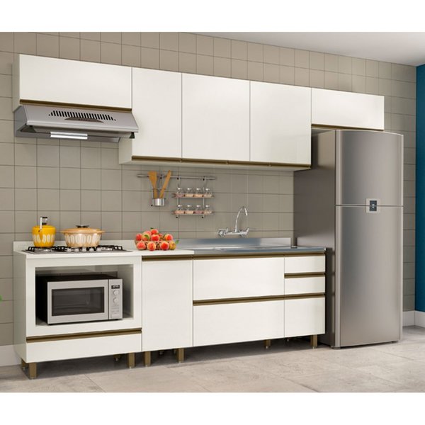 Cozinha compacta vicenza k110 dalla costa o kit cozinha vicenza k110 dalla costa possui design exclusivo com linhas retas e alto brilho deixarão a decoração da sua cozinha muito mais clean, moderna e prática. Possui pés em alumínio champagne com regulagem de altura, puxadore...