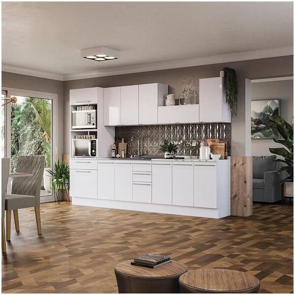Cozinha completa suprema branco 9 peçasque tal ter na sua casa uma cozinha super moderna e com detalhes encantadores? Com a nova cozinha suprema, você consegue deixar seu ambiente um charme, além de organizada e funcional para o dia-a-dia. Sua composição clean, na cor branca, combina perfeitamente com seus os puxadores na cor champagne. O detalhe do vidro na cor bronze, traz ainda mais sofisticação ao seu espaço.características:material em mdp de 15mm de espessurapuxadores de alumínio na cor champagne com ponteiras de plásticocorrediças telescópicasdobradiças metálicas 35mmrodapés12 portas4 gavetasobs.: cuba de pia não acompanha a cozinhacompõe a cozinha1 balcão de pia 2 portas 3 gavetas 120cm sem tampo1 balcão 2 portas 80cm1 balcão 1 porta 40cm1 kit forno e micro-ondas 2 portas 1 gaveta 70cm1 armário aéreo 3 portas 120cm1 armário aéreo 1 porta 40cm1 armário aéreo basculante 1 porta 80cm1 tampo para balcão 80cm1 tampo para balcão 40cmobs.: cuba de pia não acompanha a cozinhadimensões totais:largura: 310cmaltura: 220cm *altura do balcão + tampo: 90,5cmprofundidade: inferior 52cm / superior 34cmgarantia do fornecedor de 3 meses para defeitos de fabricação. Cor: branco | corrediças: telescópicas | gavetas: externas | matéria-prima: mdp / mdp bp | peso suportado por cada prateleira: 7 kg | peso suportado por gaveta: 6 kg | puxadores: de alumínio / metálicos | quantidade de gavetas: 1 / 3 | quantidade de portas: 1 / 2 / 3 | quantidade de prateleiras: 1 / 2 / 3 | sistema de montagem: parafuso philips / parafuso philips e minifix | tipo de porta: bater