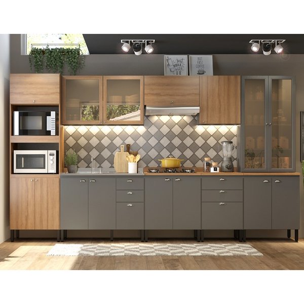 A novíssima cozinha vivenda traz um belo conceito inspirado nas clássicas cozinhas em estilo europeu, unindo qualidade, design e uma perfeita combinação de tonalidades nos padrões grafite e mel bp. Possui ainda a elegância e suavidade das portas em mdp de 15mm, deixando a cozinha ainda mais sofisticada e incomparável. características: material do produto: corpo e portas em mdp de 15mm. Fundos do módulo em mdf de 3mm. estrutura: mdp pintura e revestimento: bp e pintura impressão com vernizes uv acabamento: sensitive número de portas: 15 portas dobradiças: metálicas número de gavetas: 06 dimensões: altura: 223 cm largura: 402 cm profundidade: 51 cm peso: 246,34 kg sistema de montagem com parafusos e cavilhas, acompanha cantoneiras de fixação na parede. garantia de 06 meses