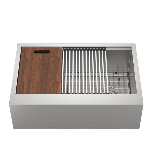 A nova cuba de cozinha foi pensada para transformar a experiência na cozinha. Seu design minimalista e imponente se alia a uma seleção de acessórios que ampliam as possibilidades no uso diário. Tábua de madeira nobre: perfeita para cortes rápidos trazendo praticidade para o dia a dia; escorredor em aço inox: encaixe preciso e otimização do espaço da bancada; grade de proteção: além de preservar o fundo da cuba, serve como escorredor de louças e utensílios.
