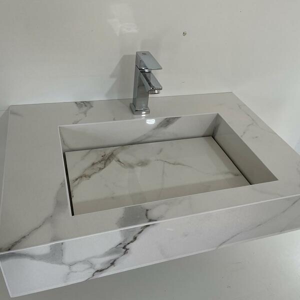 Cuba para banheiro suspensa.    porcelanato polido calacata.   medidas: 60x40 com saia de 12.   furação para torneira 3,5.   acompanha espelho 9 cm frente lateral.   acompanha mão francesa e parafusos para instalação.   não acompanha torneira.   não acompanha vá...