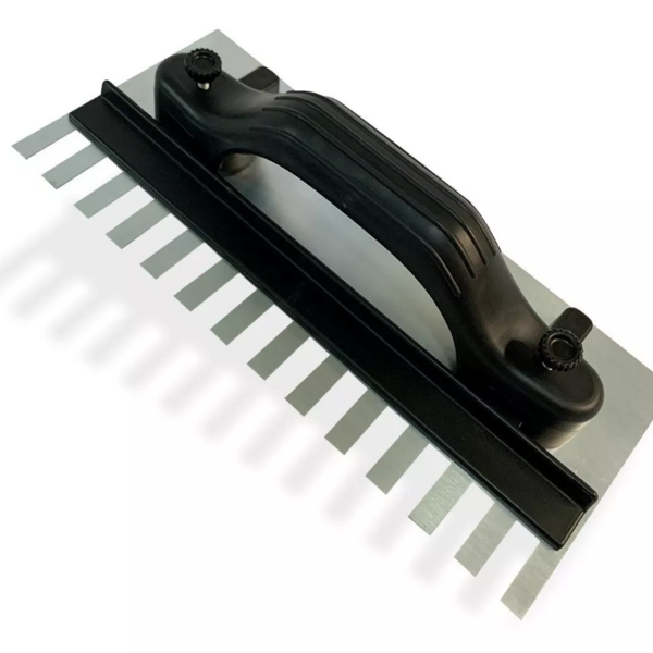 com um cabo em plástico de engenharia, a ferramenta proporciona conforto e segurança durante o uso, permitindo um manuseio fácil e eficaz. O modelo dentado regulável é especialmente projetado para garantir uma aplicação uniforme, facilitando o assentamento de materiais com perfeição.