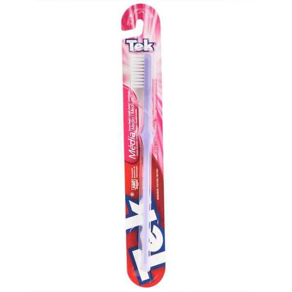 Escova dental tek cerdas média as escovas de dentes tek foram as primeiras do mundo a apresentarem cerdas de nylon. Possui cabeça ovalada e pequena que alcança os lugares mais difíceis da boca sem machucar a gengiva. Seu cabo fino proporciona melhor manuseio e suas cerdas sã...
