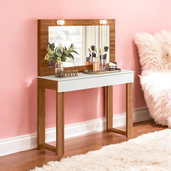 Transforme seu quarto em um verdadeiro refúgio de beleza e organização! Nossa escrivaninha multifuncional é a peça-chave que você precisa para criar um ambiente elegante e funcional. Com espelho, porta-joias e diversos compartimentos, ela oferece tudo o que você precisa para cuidar de si mesma e deixar seus pertences sempre à mão. Não perca essa oportunidade e garanta já a sua! A escrivaninha penteadeira possui um amplo espelho iluminado por leds. Informações do produto: penteadeira: altura:136,5 cm largura:110 cm profundidade:36cm informações adicionais penteadeira: possui gavetas: sim (1) cor principal:cinamomo mel/branco fosco material principal: mdp possui espelho: sim possui portas: não possui led: sim pés: sim (4) itens inclusos: 1 escrivaninha penteadeira manual de montagem kit completo para montagem e manual de instruções garantia: 3 meses contra defeito de fabricação informações adicionais: - fotos meramente ilustrativas do produto no ambiente. - os objetos que ambientam as fotos não acompanham o produto; - verificar descrição e tamanho do produto antes da compra. - avaliar a mercadoria no ato do recebimento e recuse em caso de divergência ou danos. - mantenha as informações de contato e endereço de entrega atualizados para entrarmos em contato caso necessário. - limpar com flanela ou pano macio seco, não utilizar produtos abrasivos, desengordurantes, álcool ou solvente. Não expor o produto diretamente à luz solar e à umidade. - sugerimos a contratação de um montador profissional para a montagem do produto. Não nos responsabilizamos por danos causados no ato da montagem. - não nos responsabilizamos pela montagem e desmontagem do produto no ato da entrega e devolução, assim como os custos gerados nestas situações. - a transportadora entregará o produto no andar térreo do endereço de entrega. - não nos responsabilizamos por subir escadas, corredores e elevadores ou transporte por guincho em apartamentos.