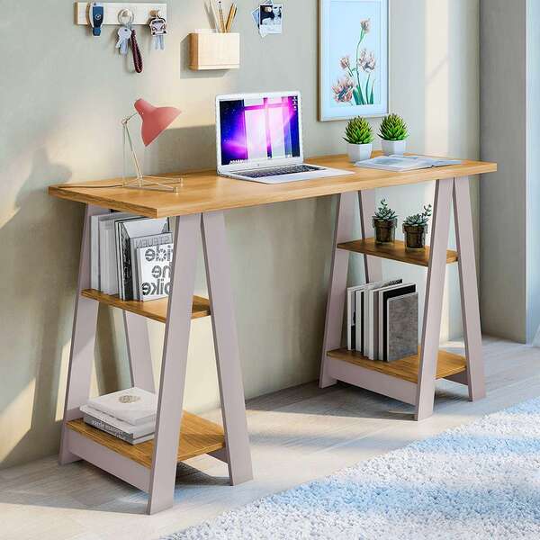 Que tal a escrivaninha vital?perfeita para criar um cantinho de trabalho ou estudo em sua casa, a escrivaninha vital tem visual charmoso e estrutura cheia de funcionalidade. Enquanto o espaço de tampo é amplo para receber seu notebook, caderno e luminária, as prateleiras no cavalete podem ser usadas para expor peças decorativas, como pequenos vasos, ou para organizar seus livros. Já o acabamento amadeirado e a cor neutra da base combinam bem com qualquer cadeira, além de não roubarem completamente a atenção no cômodo. Uma ótima escolha, né? :)