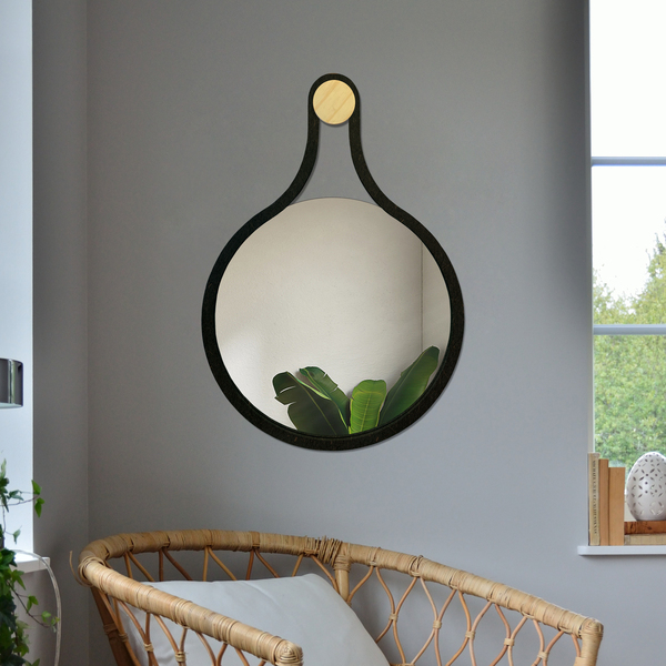 Se você gosta de decoração moderna, este espelho é uma ótima opção! Ele possui uma bela moldura feita de madeira MDF na tonalidade preta e formato redondo, que quando instalado na parede se parece com um formato de uma gota e dá um toque sofisticado ao seu ambiente.