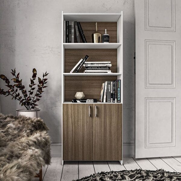 Estante com portas branco/castanho. A estante com portas politorno é perfeita para o seu home office, quarto, sala, escritório, consultório ou loja, pois você sempre vai querer deixar livros, pastas, porta-retratos, objetos decorativos ou produtos a mostra, mas tendo que esc...