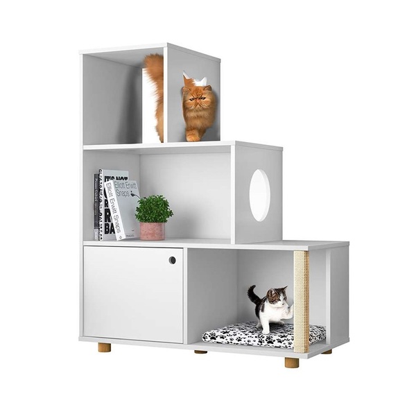Que tal a estante pet siamês?a estante siamês é um móvel democrático com benefícios para humanos e felinos! De visual discreto, ela combina a retilineidade com os pés pequenos, conferindo charme e delicadeza para a decoração da sua casa - seja na sala de estar, quarto, escritório… estruturalmente, a peça tem nichos (sendo 1 com porta) disponíveis para você colocar objetos em geral, seja para utilizá-los de enfeites ou apenas guardar. Mas a graça do item está na usinagem presente nas laterais que servem de entrada para o seu gatinho descansar lá dentro, afinal, eles adoram se acomodar em lugares inusitados, né? Ah, a escolha da cor branca não fica pra trás e te dá muitas possibilidades na hora de mobiliar o espaço e deixá-lo agradável para todos.