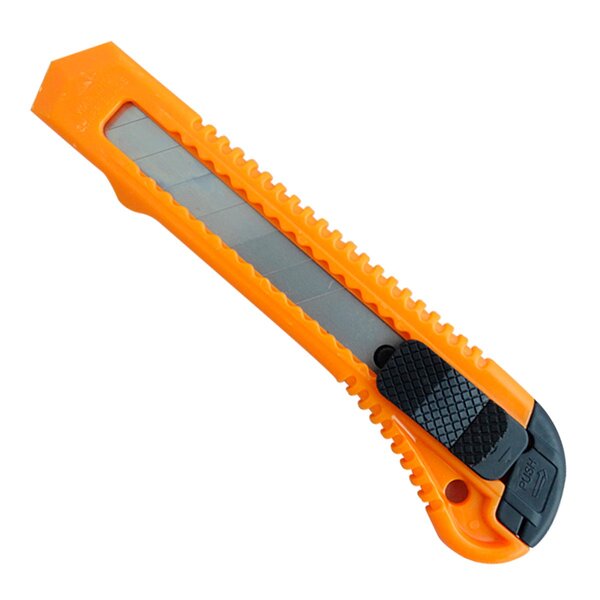 o estilete tem corpo de plástico com guia de metal, botões para ejetar e fixar a lâmina. A substituição da lâmina é feita a mão pela parte traseira do estilete. Projetado para cortar papel, papelão e outros materiais. Com botão para travamento da lâmina, mantendo-a retraída quando não está em uso, oferecendo maior segurança para o usuário.
