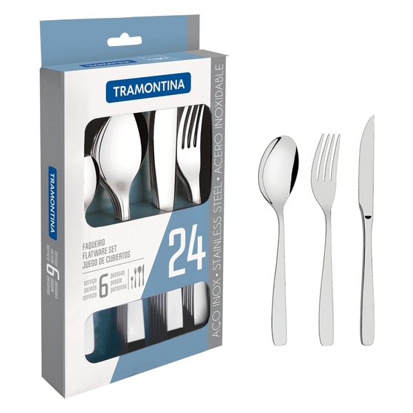 Faqueiro aço inox 24 pç.material: aço inox.durante a lavagem, use apenas sabão ou detergente e uma esponja macia. Outros tipos de produtos como palha de aço, poderão riscar ou prejudicar o brilho dos talheres. Enxágue bem cada peça a fim de remover totalmente os resíduos dos produtos de limpeza,pois, por serem abrasivos, podem prejudicar o inox. Sempre que possível, use água quente, pois renova o brilho do talher. Após a lavagem, enxugue imediatamente os talheres, caso contrário, as substâncias químicas da água (cloro) poderão causar manchas.evite atrito entre os talheres durante o processo de lavagem e no armazenamento, para mantê-los sem riscos. Evite o contato das peças com superfícies quentes. Elas provocam a descoloração do produto. Não guarde os talheres em locais úmidos. A umidade também provoca manchas. Ao usar a lava-louça, recomendamos retirar os talheres logo que tenha terminado o ciclo enxaguar , a fim de que sejam secados manualmente.- peças totalmente feitas de aço inox, altamente duráveis, mantêm suas características originais, preservando a beleza, a higiene e a durabilidade do material. - colheres com bojo em formato simétrico e bordas cuidadosamente arredondadas. - garfos com dentes polidos na parte interna, com formato apropriado para a boca e bordas arredondadas para proporcionar maior conforto no uso. - facas totalmente temperadas, que garantem maior durabilidade no fio de corte e maior resistência à corrosão, e por suas características de temperabilidade, não riscam as porcelanas. - acabamento em brilho. - próprias para uso diário combinam com qualquer ambiente. - podem ser lavadas diariamente na máquina de lavar louças.ean13: 7891116035184dun14: 17891116035181ncm: 8215.20.00peso líquido: 0,8800 kg.peso bruto: 0,9630 kg.metragem: 0,001283 m³.dimensões embalagem (compr. X larg. X alt.): 225x 148x 34 mm.código referencia tramontina: 66950014empresa tramontina: farroupilhacomposição: 6 63950017 colher de mesa 6 63950077 colher para chá 6 63950187 faca para churrasco 6 63950027 garfo de mesalinha comercial: cosmos