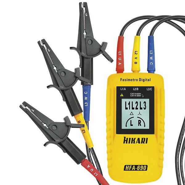 o fasímetro digital modelo hfa-690 categoria de segurança cat iii 600v/cat iv 300v se destaca por detectar o campo rotativo de sistemas trifásicos. O instrumento é destinado a verificar a direção de fase ac em sistemas trifásicos sinalizando o usuário através do vi...