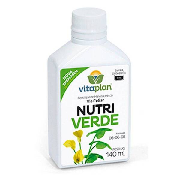 Fertilizante mineral misto nutriverde (140ml) vitaplan   descrição * é um fertilizante que contém proporção equilibrada de nitrogênio, fósforo e potássio.  * aplicado nas folhas ou nas raízes, repõe rapidamente os nutrientes que a planta necessita naquele momento mantendo-as saudáveis por muito mais tempo.  * fertilizante líquido, prático e de fácil aplicação.   características * tipo do produto: líquido concentrado  * composição: nitrogênio (n) solúvel em água.................................................06 p/p (4,8 p/v) * fósforo (p2o2) solúvel em água..............................................06 p/p (4,8 p/v) * óxido de potássio (k2o) solúvel em água............................08 p/p (6,4 p/v) * densidade.......................................................................................1,25 * natureza física..............................................................................suspensão homogênea * fórmula: 06-06-08 * material: mineral misto * embalagem do produto:140ml   informações/dicas/usos * tampa dosadora 5ml * precisa ser diluído para só então ser aplicados nas folhas ou solo.