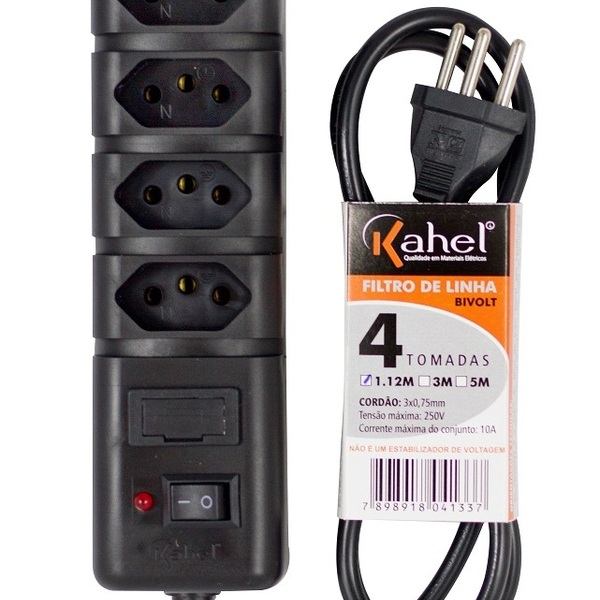 filtro de linha com fusível 4 tomadas 2p+t cabo 1,12 metros. Filtro de linha com fusível de proteção. Cabo 1,12m modelo: 4 tomadas / abs: preto bivolt: pode ser utilizado em 110/127 e 220 volts / tipo de tomada: nbr14136 10a aplicação: eletrônicos, smartphones, tablets, laptops, impressoras, computadores, videogames entre muitos outros aparelhos. Iitens inclusos: 1 filtro de linha kahel com corpo plástico (abs) com 4 tomadas