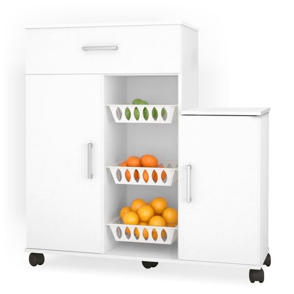 Fruteira Portugal Branco O Fruteira Portugal é ideal para guardar suas frutas prediletas e ainda organizar melhor sua cozinha. Elaborada em MDP de 12 mm e 15 mm, possui 3 cestos para frutas, 2 portas com puxador de plástico, 1 gaveta com puxador de plástico e rodízio. Informa...
