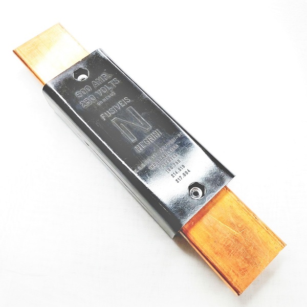 Fusível tipo faca, corpo de baquelite, corrente nominal 600a, tensão de isolação 250vca. Fabricante: Negrini